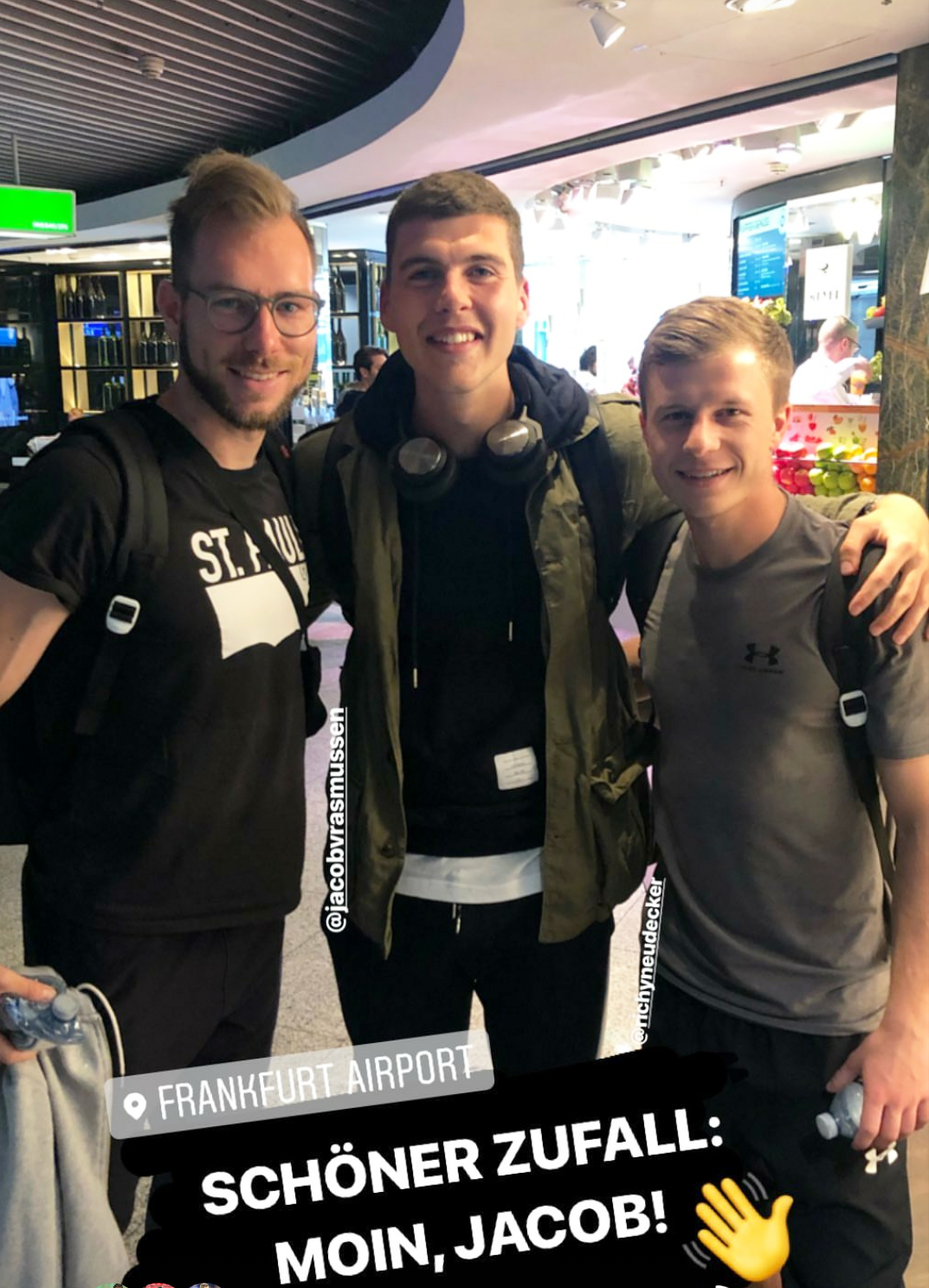 Unsere Kiezkicker sind zurück in Deutschland! Nach einem gut achtstündigen Flug landete der Flieger in Frankfurt. Von der Mainmetropole aus ging's nach einem kurzen Zwischenstopp um 10 Uhr dann weiter in Richtung Hamburg. Überraschung: In Frankfurt trafen unsere Boys in Brown Jacob Rasmussen! Zeit für einen kurzen Talk mit dem Abwehrspieler, der seit Januar 2019 beim AC Florenz unter Vertrag steht, die Saison 2018/19 aber auf Leihbasis für den FC Empoli beendet hat, war noch drin, dann ging's aber auch schon weiter zum Boarding. Gegen 11:15 Uhr wurden unsere Jungs dann in Hamburg erwartet.