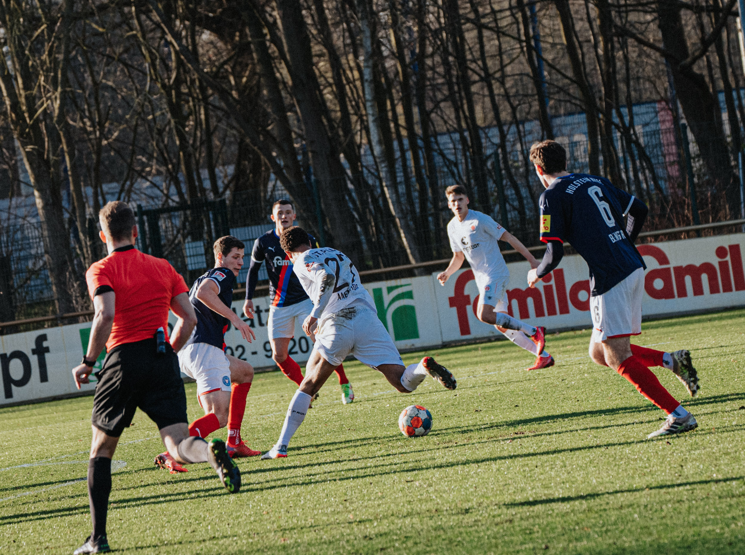 Die Kiezkicker begannen druckvoll, nach fünf Zeigerumdrehungen fehlte zum ersten Torerfolg nicht viel, als Lukas Daschner im Strafraum aus halbrechter Position zum Abschluss kam und das Leder nur knapp am rechten Torpfosten vorbeistrich (5.). Genauer machten es die Gastgeber, als eine Flanke von Fabian Reese mit viel Effet in die FCSP-Box segelte, an Freund und Feind vorbei ging und neben dem langen Pfosten im Netz landete – das 1:0 für die Kieler (9.). Doch den Offensivbemühungen unserer Jungs tat das keinen Abbruch. Eine knappe Viertelstunde war gespielt, als Etienne Amenyido einen abgewehrten Eckball aus 18 Metern Volley nahm und der Ball nur hauchdünn über den Kieler Kasten ging (14.).